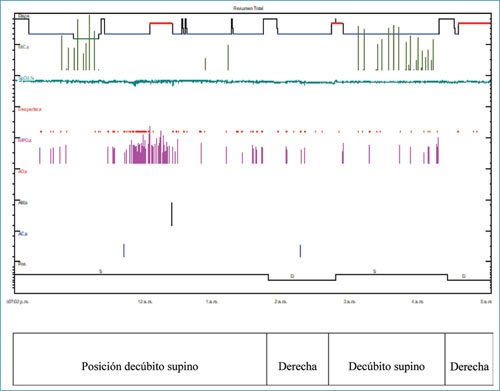 Figura 1. Apnea obstructiva del sueño postural. Polisomnografía con claro predominio de apneas e hipopneas obstructivas durante el decúbito supino independiente de la fase del sueño.