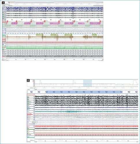 Figura 2. Apnea obstructiva del sueño posicional exclusiva. Se pueden observar dos épocas de 5 minutos durante estudio de polisomnografía basal. A: paciente en posición supina presentando ronquido e hipopneas asociados a desaturación y microalertamientos en N2. B: paciente en posición decúbito lateral izquierdo con persistencia de ronquido, sin eventos respiratorios obstructivos ni desaturación en N2.