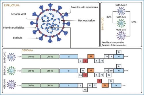 Figura 1. Biología viral: estructura, proteínas y genoma del SARS-CoV-2, agente etiológico de la COVID-19. Comparación de la estructura del genoma con otros betacoronavirus humanos más cercanos (SARS-CoV y MERS-CoV), y homología de nucleótidos.
