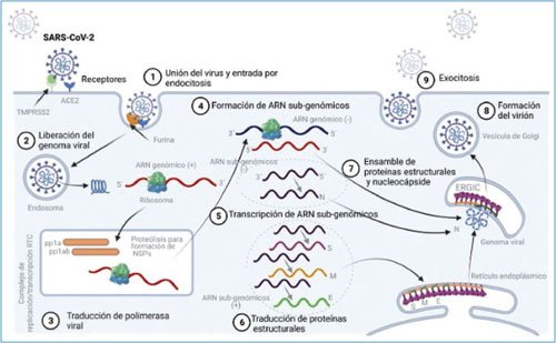 La infección a la célula blanco comienza con la unión al receptor de la enzima convertidora de angiotensina 2 (ACE2, angiotensin-converting enzyme 2) y el corte proteolítico de la proteína S, ya sea de forma extracelular por la serina proteasa transmembrana-2 o por la furina, en vesículas citoplásmicas (Fig. 2). El corte proteolítico en la proteína S da como resultado la formación de dos subunidades S1 y S2; en esta última se encuentra el péptido fusión que interacciona con la membrana celular dando como resultado final la introducción del RNA genómico viral al citoplasma10. Debido a que el RNA genómico es de polaridad positiva, este puede ser tomado como molde por los ribosomas celulares para la producción de los polipétidos ORF1a y ORF1ab. Las primeras proteínas que se sintetizan a partir de estos polipéptidos forman un complejo de replicación y son principalmente enzimas (RNA polimerasa dependiente de RNA) encargadas de la transcripción y la producción de RNA subgenómicos y genómicos. Los RNA subgenómicos codifican para las proteínas estructurales (N, E, M y S) y para las proteínas accesorias. El RNA genómico es ensamblado con las proteínas de nucleocápside y las proteínas virales ancladas en membranas celulares, formando nuevos viriones que son liberados de la célula por medio de gemación11 (Fig. 2).