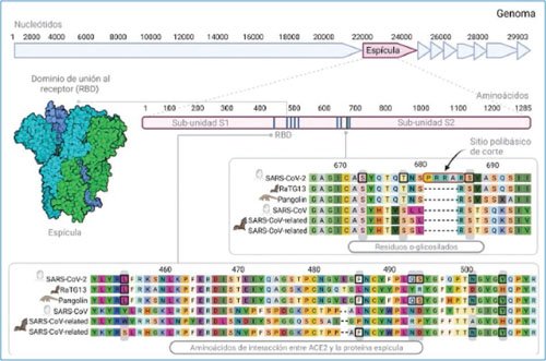 Figura 3. Proteína Spike (S) del SARS-CoV-2 y dominio de unión al receptor (RBD). La proteína S tiene aproximadamente 1300 aminoácidos y en la región S1 se encuentra el RBD; se conocen al menos seis posiciones de interacción con el receptor celular ACE2. En la región S2 se encuentra el sitio polibásico de corte (recuadros). Se muestra una alineación de la secuencia de aminoácidos de estas regiones comparando la secuencia del SARS-CoV-2 con la de otros betacoronavirus de aves y otros mamíferos. ACE2: enzima convertidora de la angiotensina 2.