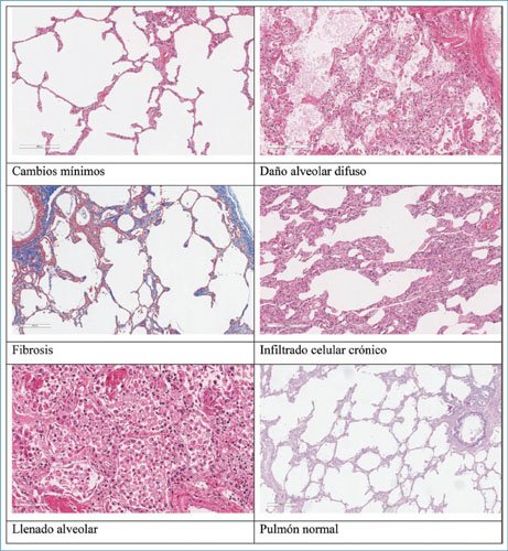 | 1. Daño alveolar difuso | Exudado agudo en el interior de los alveolos con llenado parcial, formación de membranas hialinas, depósitos de tejido de granulación y proliferación de fibroblastos |