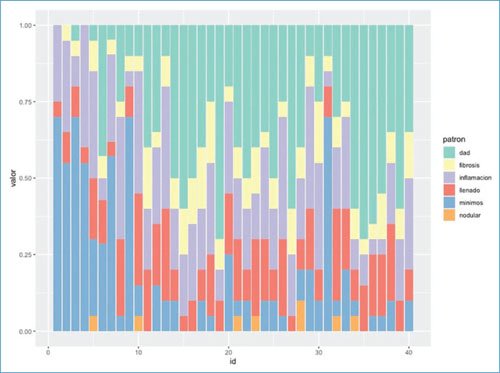 Figura 2. Ilustración gráfica de la distribución de los patrones histopatológicos pulmonares de 40 pacientes fallecidos por COVID-19 grave.