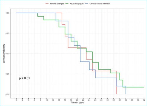 Figura 3. Curva de sobrevida (Kaplan-Meier) de los pacientes graves fallecidos por COVID-19, de acuerdo con el patrón histológico.