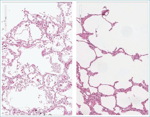 La revisión sistemática realizada por Polak et al.7 reveló que algunos hallazgos histopatológicos en los pulmones difieren significativamente entre la COVID-19 y el SIRA convencional y otras formas de neumonitis viral. Los cambios pulmonares que se encuentran típicamente en el SIRA incluyen neumonía intersticial aguda con edema y DAD con diversos grados de organización8. Los hallazgos histopatológicos en la neumonitis por influenza a menudo incluyen trombosis capilar y de vasos pequeños, edema intersticial, infiltrados inflamatorios intersticiales neutrófilos y linfoplasma histiocíticos, formación de membranas hialinas, grados variables de edema o hemorragia intraalveolar y DAD agudo, además de bronquitis necrotizante y bronquiolitis. Las etapas posteriores de la enfermedad incluyen DAD organizado, fibrosis, regeneración epitelial y metaplasia escamosa7. En otras infecciones por coronavirus, como el síndrome respiratorio de Oriente Medio y el síndrome respiratorio agudo grave previo causado por el SARS-CoV, los pacientes desarrollan una oclusión de las vías respiratorias pequeñas por detritos debido a la denudación de las vías respiratorias, así como infiltrados de células inflamatorias, hemorragia, edema alveolar y formación de membranas hialinas, características clínicas típicas de la etapa exudativa del DAD9. En contraste, el cuadro histopatológico de la neumonitis relacionada con COVID-19 parece abarcar patrones epiteliales, vasculares y fibróticos de lesión pulmonar10.