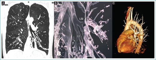 Figura 1. A: tomografía de tórax con ventana pulmonar y corte coronal a nivel de bronquio principal izquierdo. Se observan bronquiectasias arrosariadas (estrella) y división de tres bronquios: superior, medio e inferior. B: reconstrucción en tercera dimensión que demuestra carina secundaria con división de tres bronquios lobares. C: reconstrucción vascular del patrón arterial observando irrigación para lóbulo superior, medio e inferior de lado izquierdo.