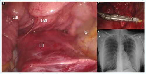 Figura 2. A: foto quirúrgica que demuestra cisura mayor y menor dividiendo pulmón izquierdo en lóbulo superior izquierdo (LSI), lóbulo medio izquierdo (LMI) y lóbulo inferior izquierdo (LII). La estrella marca la pared posterior del hemitórax izquierdo. B: manejo vascular de la arteria de lóbulo inferior izquierdo. C: radiografía de tórax en proyección posteroanterior del posquirúrgico inmediato con adecuada expansión pulmonar.