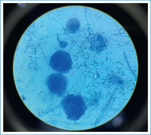 Figura 2. Aislamiento de Aspergillus nidulans con células de Hulle en tinción azul de lactofenol.