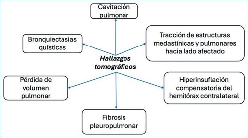 Los factores de riesgo identificados en series de casos son pacientes hombres, edad media de presentación de 55 años, diagnóstico de tuberculosis durante la infancia o adolescencia5. Los pacientes con esta afección suelen presentarse inicialmente asintomáticos y finalmente desarrollar sintomatología crónica con tos productiva en ocasiones purulentes, hemoptisis, fiebre y disnea. A la exploración física puede encontrarse asimetría en tórax a expensas de hemitórax afectado, con disminución y horizontalización de los espacios intercostales8. Imagenológicamente en radiografía de tórax posteroanterior pueden observarse radioopacidad difusa en hemitórax afectado, desviación mediastínica ipsilateral, bronquiectasias quísticas, cavitaciones, mientras que en la proyección lateral se ha descrito hiperclaridad retroesternal en relación con hiperinsuflación del pulmón contralateral9.